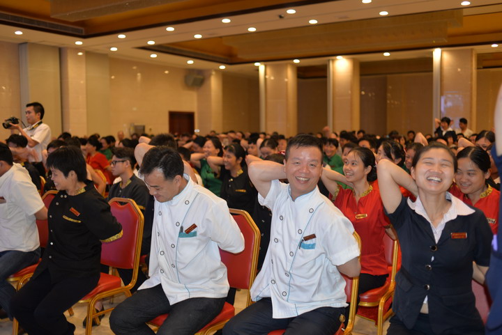 2015年(nian)8月7日,裕華酒店特邀請當地宣教辦老(lao)師為全體員(yuan)工(gong)上(shang)了一(yi)(yi)節(jie)生動(dong)的健康課。課上(shang)老(lao)師針(zhen)對職場中常見的幾種職業(ye)病做了系(xi)統的分析,并傳授大(da)家預防和治療的方法(fa)。期間(jian)老(lao)師還不時與員(yuan)工(gong)穿插(cha)一(yi)(yi)些小互動(dong),讓(rang)大(da)家親身體驗所講方法(fa)的作用。